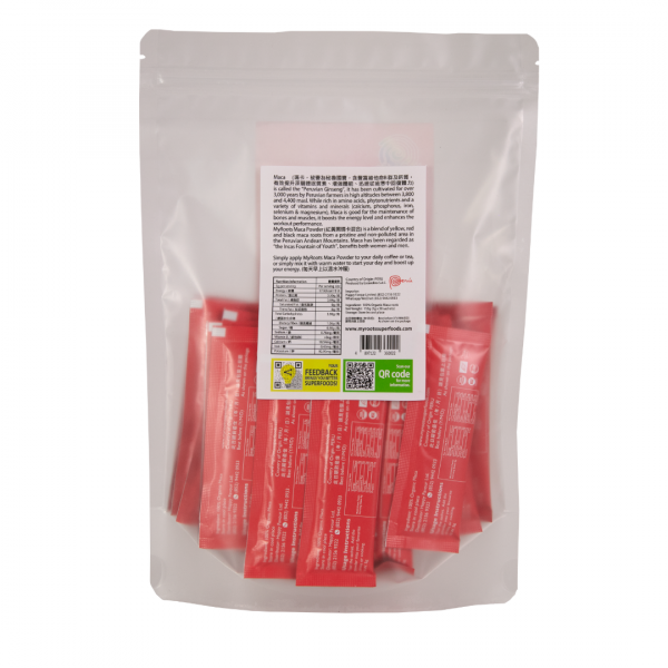 瑪卡被譽為『秘魯人蔘』,源自三千年以前秘魯高原,農民於獨一無二的4,400海拔高地開墾種植。瑪卡蘊含豐富胺基酸、植物營養素、多種維他命及礦物質(包括鈣、鉀、磷、硒、鎂、鐵等)。MyRoots瑪卡粉混合一級國際認証有機黃、紅、黑瑪卡,出產於秘魯純樸、零污染安第斯山脈。古印加人視瑪卡為『青春之泉』,亦有助舒緩女性更年期不適。